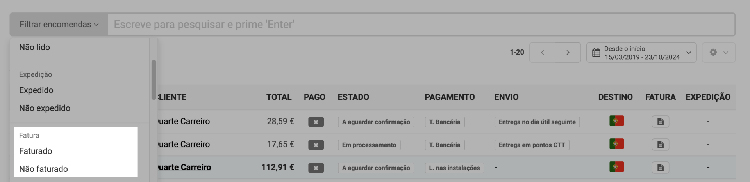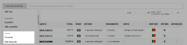 Na vista geral do menu Encomendas, pode aplicar filtros relacionados com a faturação para segmentar a listagem de encomendas apresentada:
