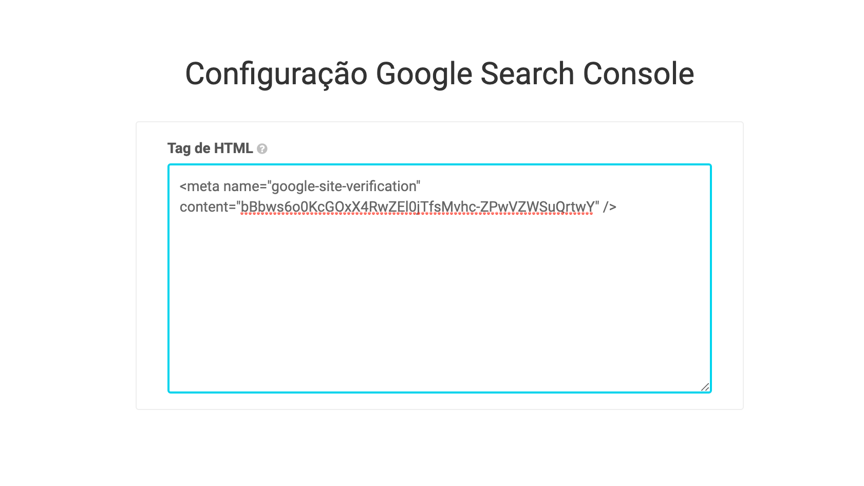 No detalhe do método de validação Tag de HTML é indicada uma tag de HTML. Basta copiar e colar a tag no detalhe da app Google Search Console em Apps / Análise / Google Search Console.
