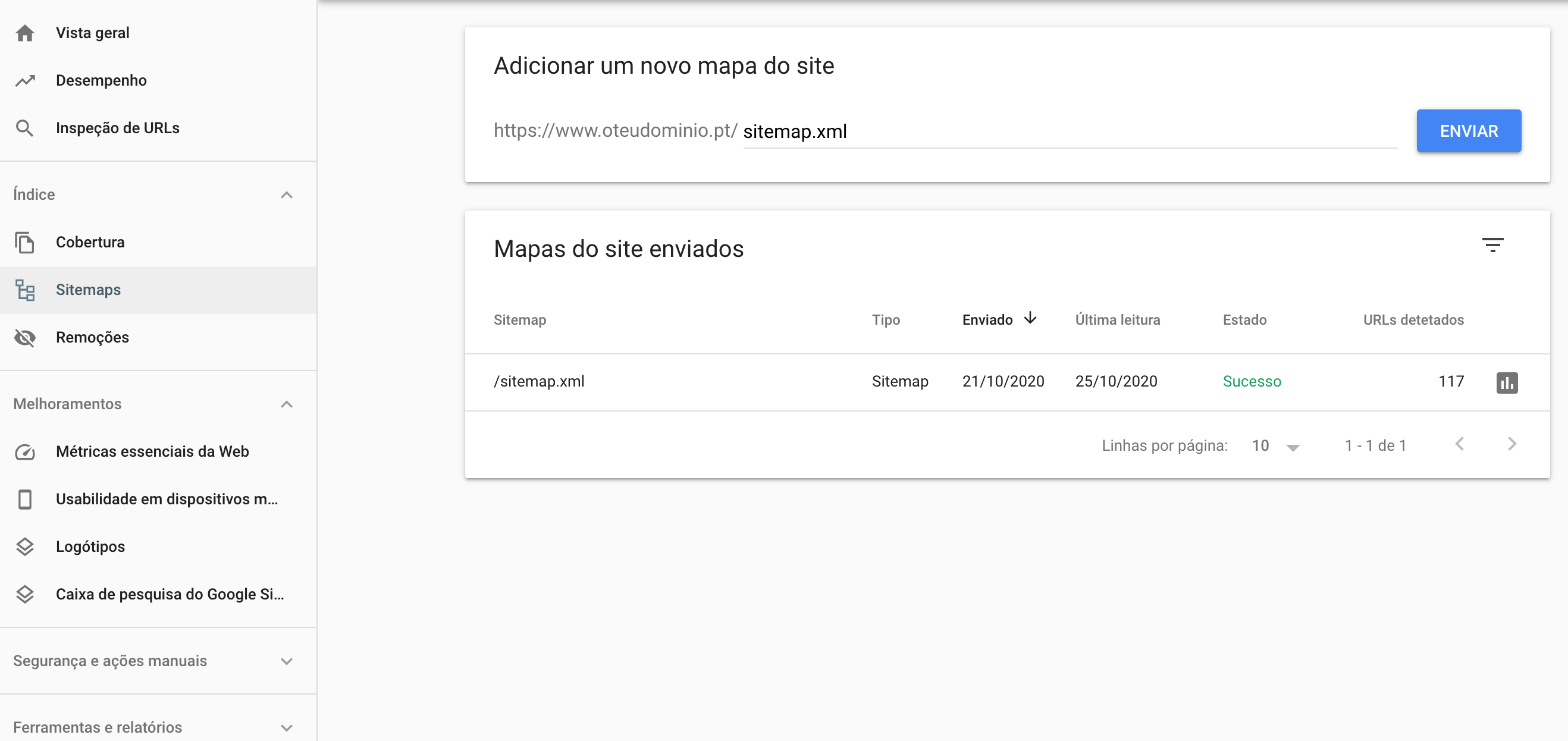 Para fazer o envio do sitemap no Google Search Console, aceda à ferramenta e, na barra de navegação lateral, clique em Sitemaps. No campo Adicionar um novo mapa do site escreva sitemap.xml e clique em Enviar.
