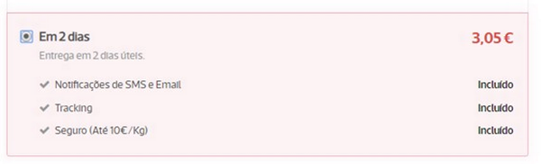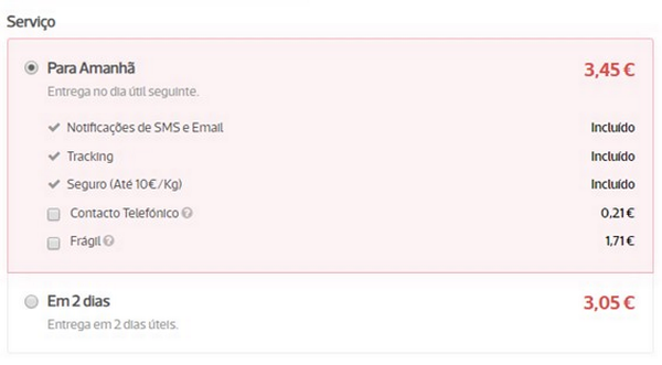 No serviço Para Amanhã a entrega é feita no dia útil seguinte e podem ser ativados os extras Contacto Telefónico e Frágil.