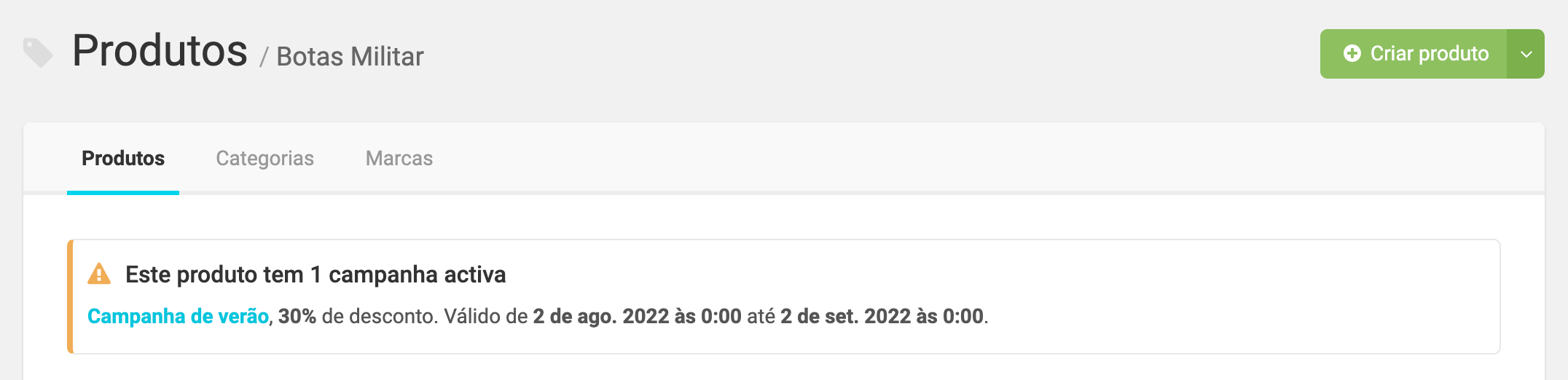 Na área de gestão da loja online, na ficha técnica dos produtos, no menu Produtos, tem a indicação da campanha que está a ser aplicada a cada produto.
