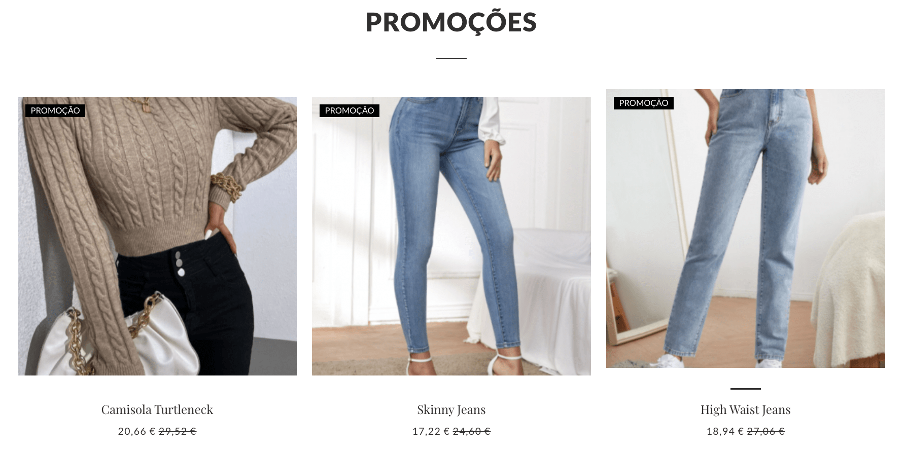 Todos os produtos abrangidos por uma campanha são identificados com a etiqueta "Promoção", nas páginas de catálogo, como as páginas "Todos os produtos" ou as de categorias.