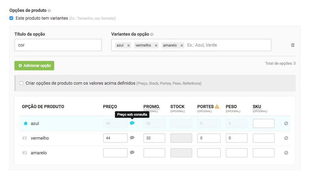 Nas opções de produto pode gerir qual ou quais as variantes com preço sob consulta: