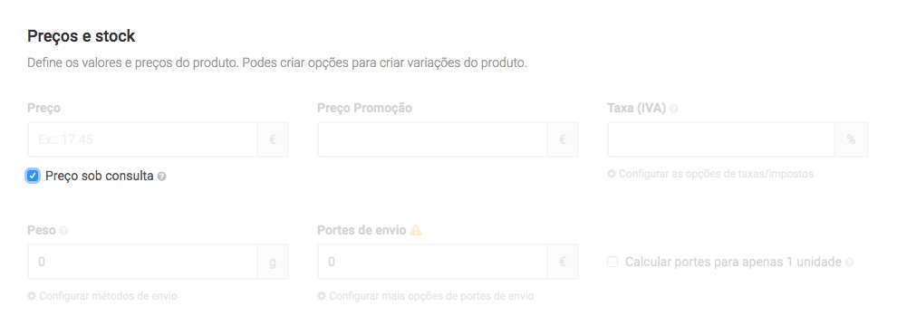 Ao ativar a opção Preço sob consulta os campos Preço, Preço Promoção, Taxa, Peso, Portes de Envio bem como os campos referentes à Gestão de Stock ficam desabilitados.