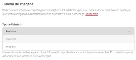 Se pretenderes que o slideshow apresente imagens de produtos com o atributo Produto é destaque de forma automática, basta seleccionares a opção Produtos, no campo Tipo de Galeria.
