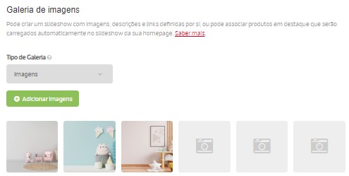 Na secção galeria de imagens pode adicionar até 6 imagens genéricas de produtos ou campanhas para que surjam no slideshow do template Boxie.