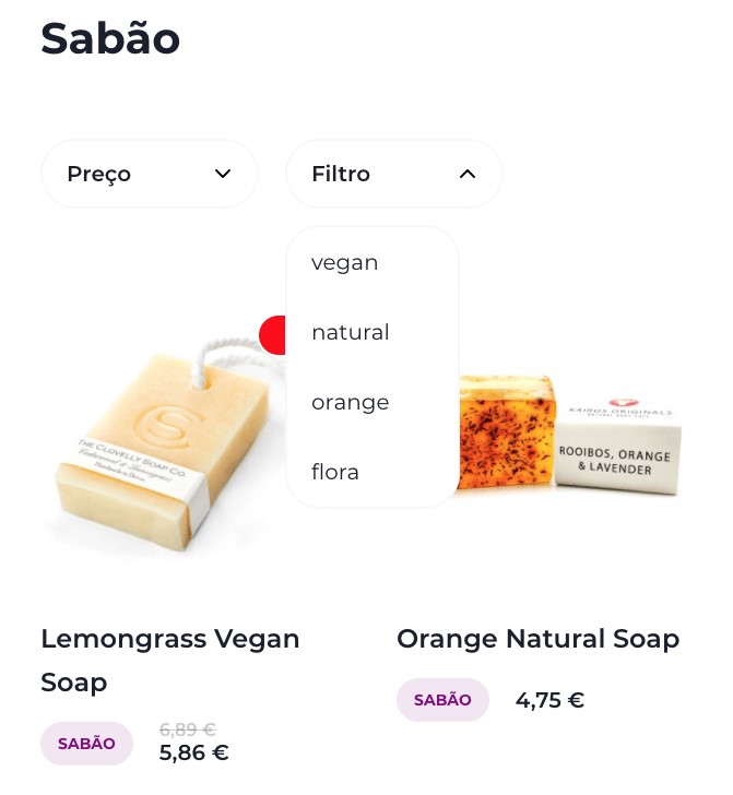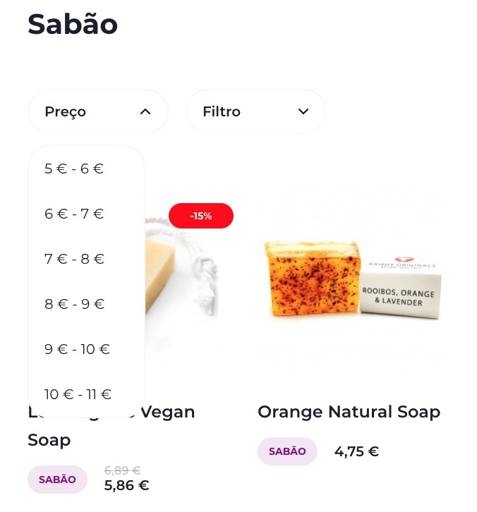 No filtro de preço, os intervalos são calculados tendo em conta o preço mínimo e o preço máximo dos produtos inseridos na página (ex: menu Todos os produtos ou página de categoria) que está a ser visitada.