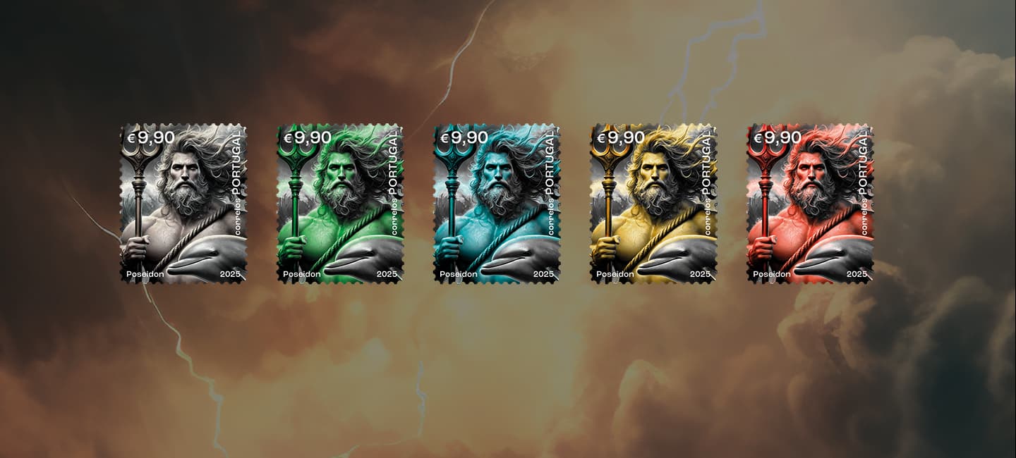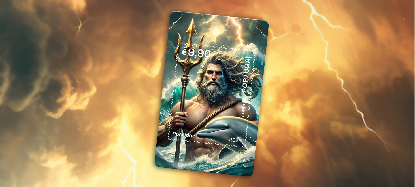 The Portuguese stamp is dedicated to Poseidon, God of the Seas in Greek Mythology, reinforcing Portugal’s Atlantic connection and its spirit of exploration. Innovation and tradition united in a single stamp.
